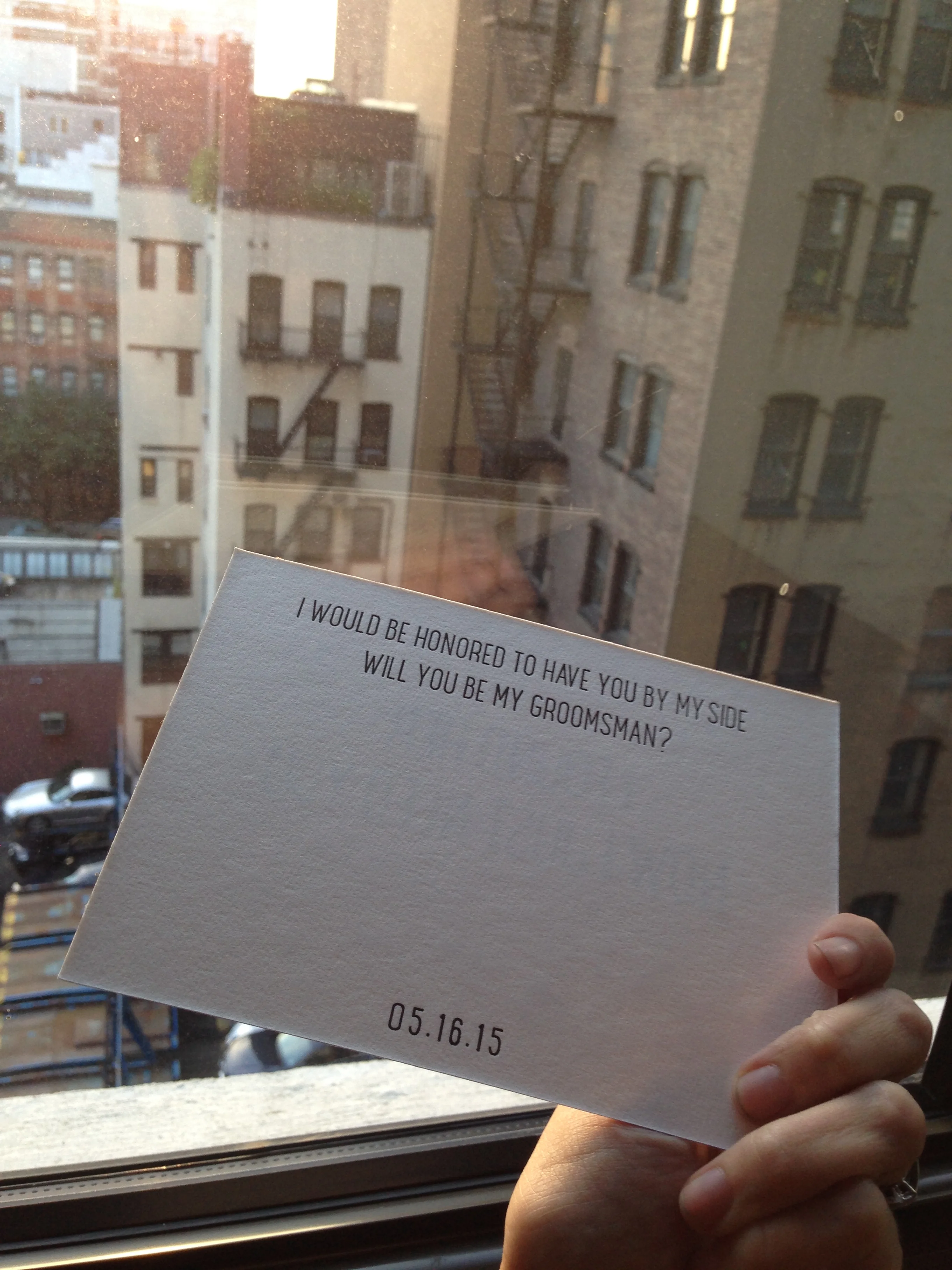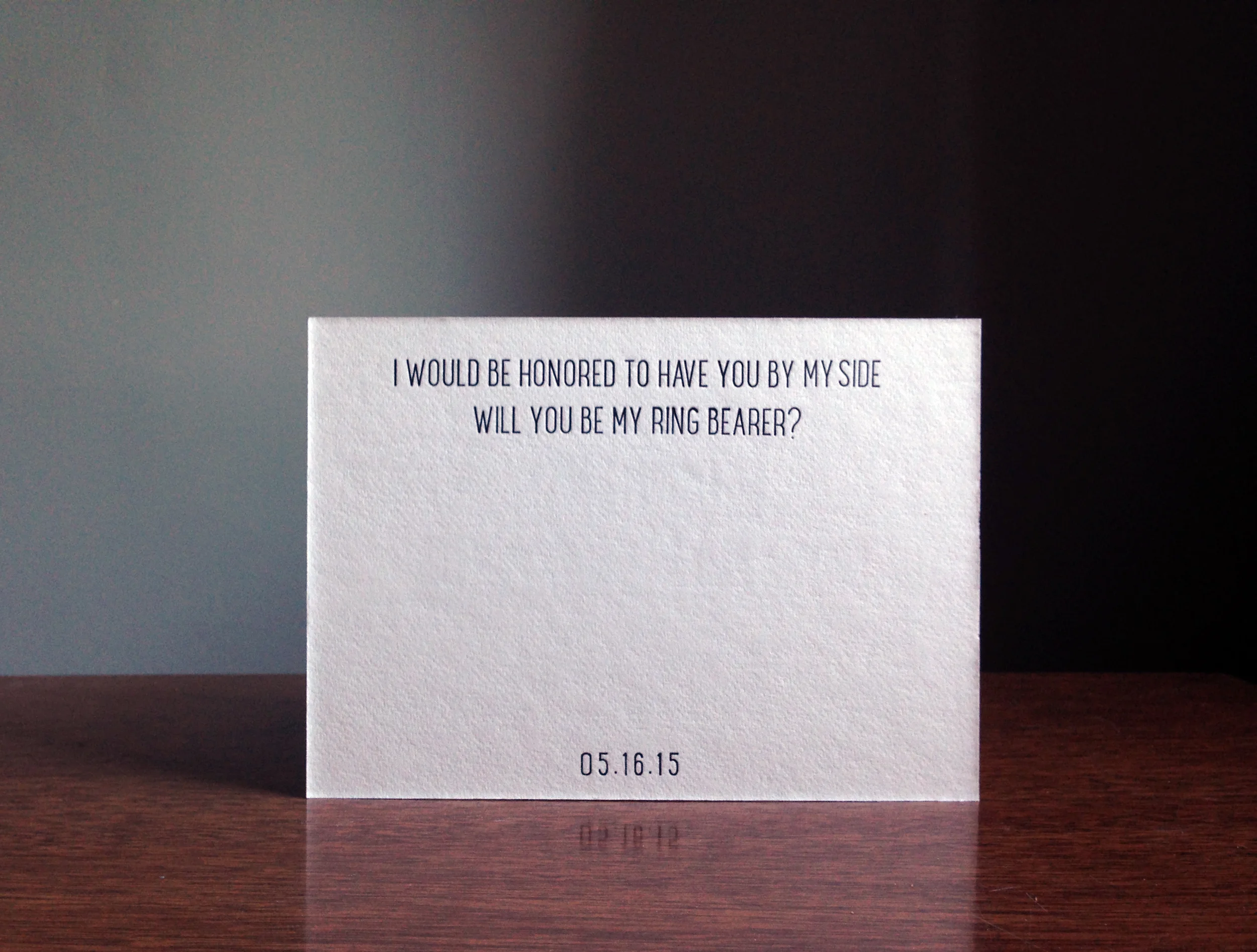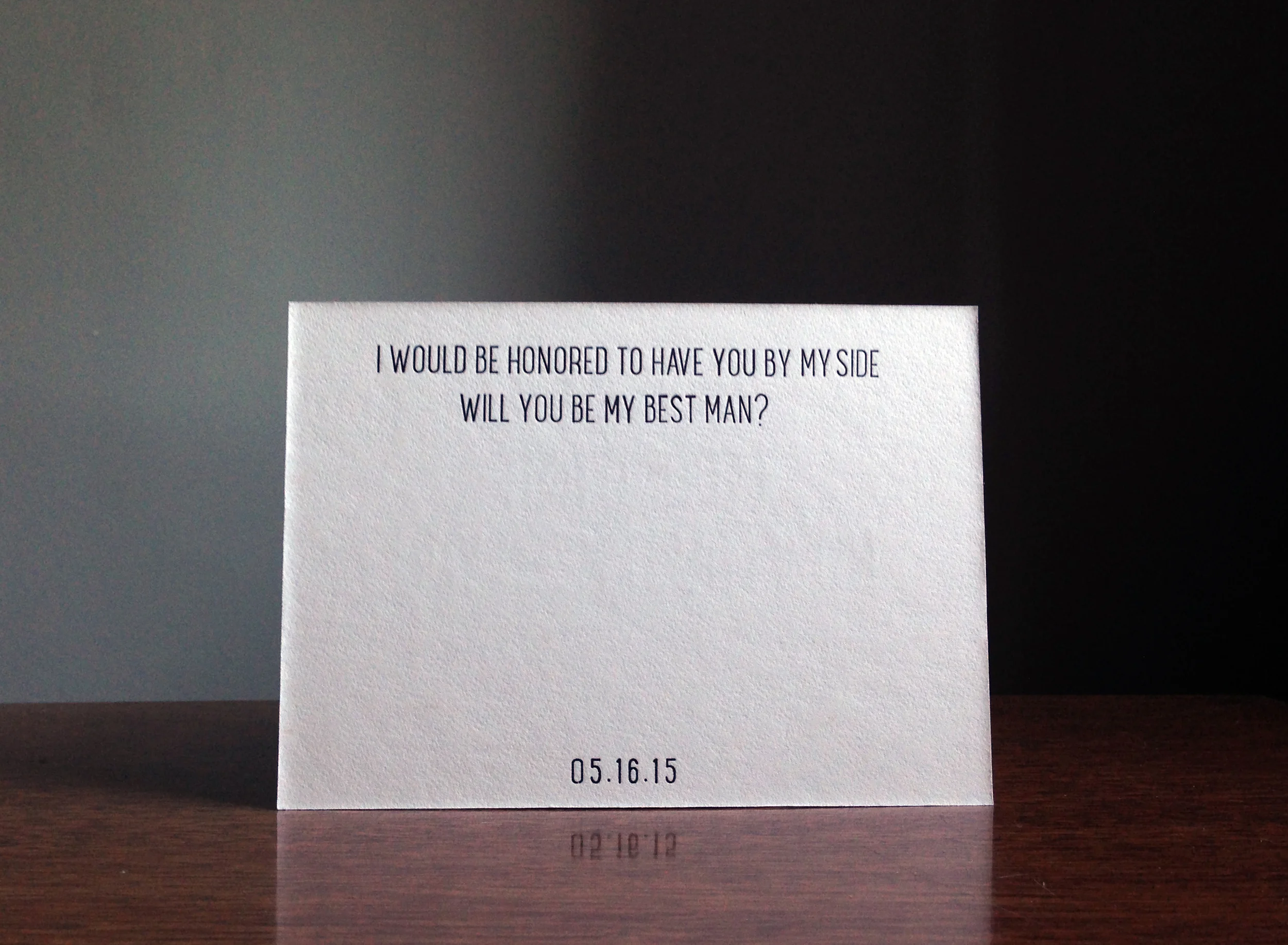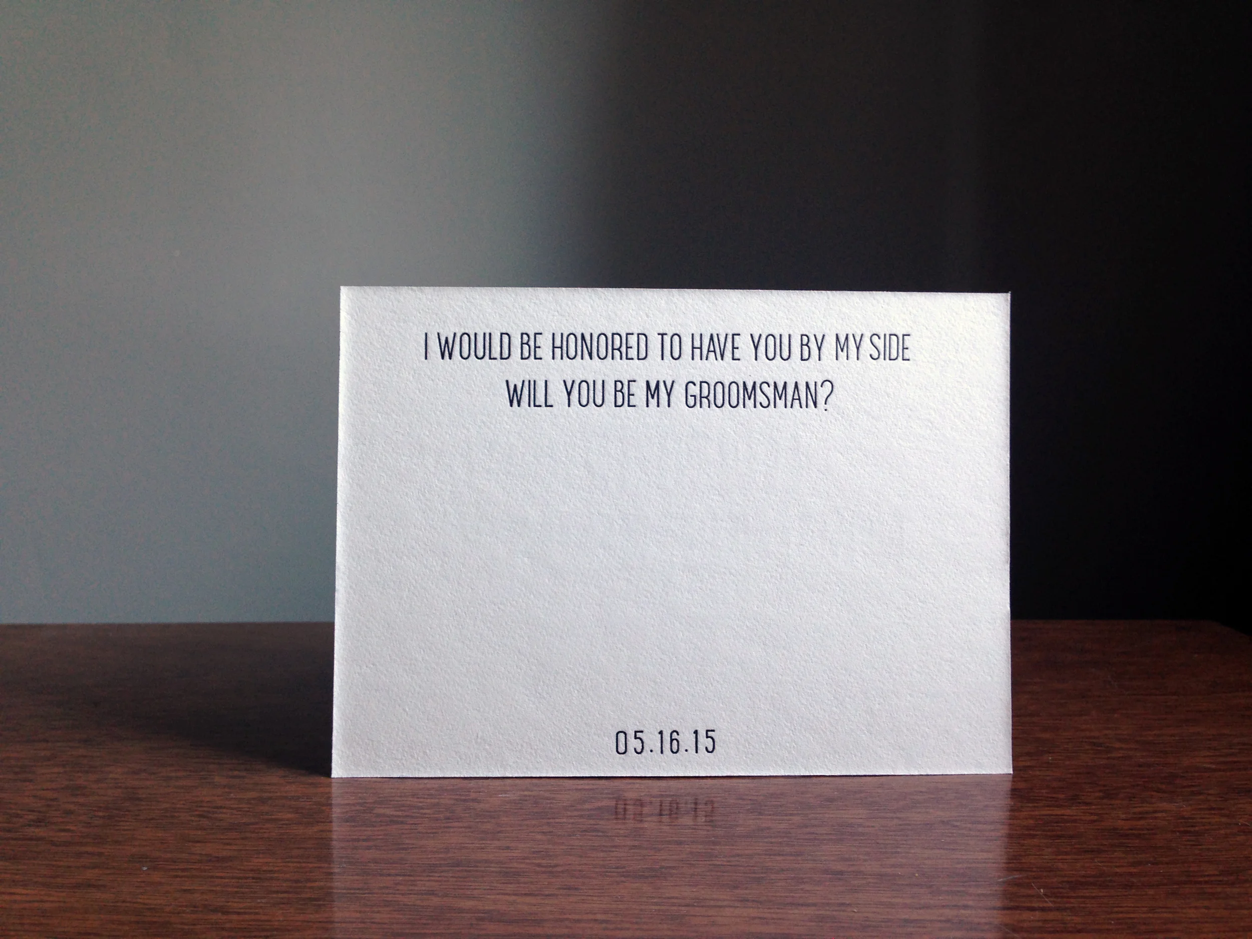 we chose simple black and white, two sided, thick letterpressed cards which all had the same saying on the front and then the back varied on who he was asking (best man, groomsman, and ring bearer) and was personalized with the date.
